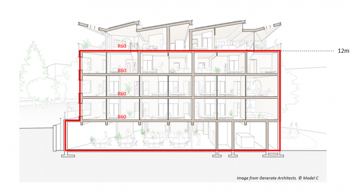 The buildings height and livable floors designate that the project in question is classed as building class 4 for fire requirements. The walls are specified as R60 fire protection to offer occupants the best chance to escape if required.