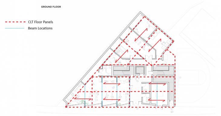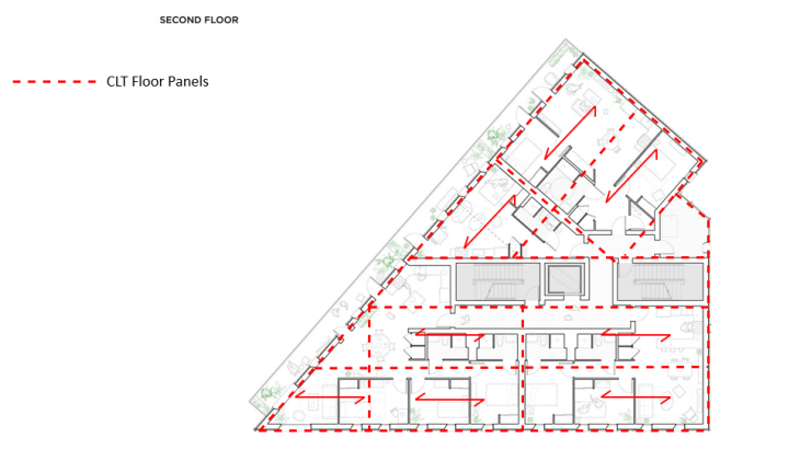 - CLT floor panels are lifted into place parallel to the core directions. The beams rest on top of the beams and structural internal walls.