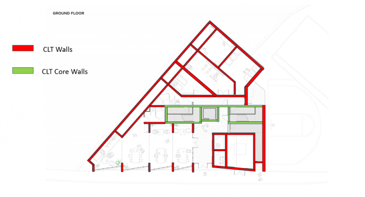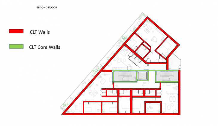 The structure is made up entirely of CLT. The exterior and interior walls are constructed utilizing CLT and support the floor structure from above as well as bracing the structure. CLT is also used to construct both the stair and lift cores. These are located in the center of the structure to anchor it down.
