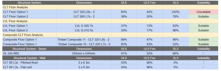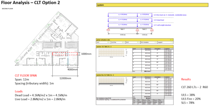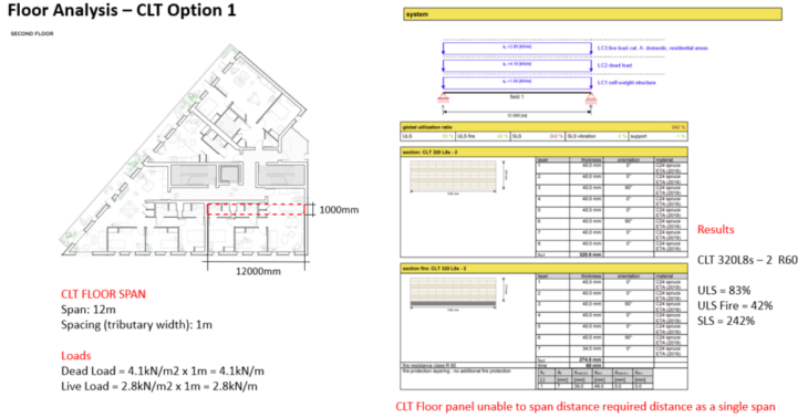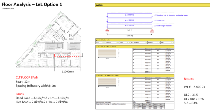 If the project was to utilize a LVL floor system, it would offer the flexibility for both floor design options. LVL, unlike CLT is able to span the 12m distance in a single panel utilizing a LVL G-S 420 7s. By utilizing floor option 2, the LVL thickness could be reduced to a LVL G 210 5s panel.