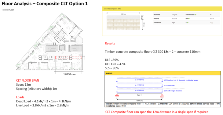 The analysis shows that, if CLT was to be utilized for the floors construction, It would be unable to span the 12m span with the maximum available CLT systems. However, by utilizing floor option 2, the CLT would be able to span the required distance.