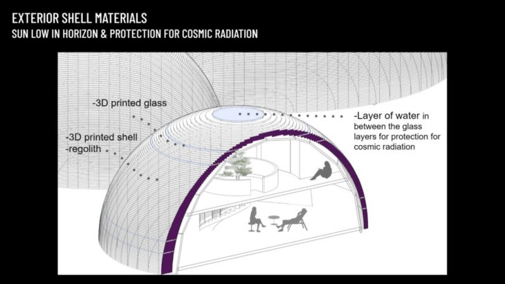 Our structures are consisting of two shells: an exterior shell (a 3D printed structure made out of regolith – lunar soil), that will protect the inhabitants from solar radiation, and an interior shell, an inflated-unfolding structure, that will keep the breathable atmosphere inside.