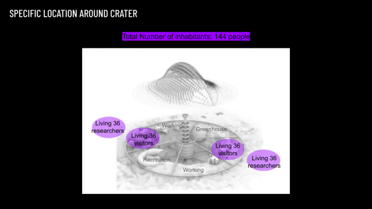 Our aim was to provide not only a livable, but also a pleasant place where the inhabitant will feel like home – a place “similar to living on the earth” (such as addition of winter garden instead of atrium or balconies) . In addition we wanted to provide a place where the residents can experience how “life on the moon” is (for example how is it to live with 1/6 of earth’s gravity). This unique “life on the moon” experience was intended to be applied mostly in the tourists living, as well as the the common space in the tourists building unit, that would be used for both scientists and tourists.