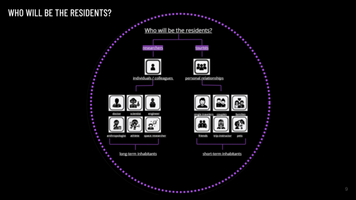 We divided our inhabitant into two main categories. The researchers/ astronauts –> long-term inhabitants and the visitors/ tourists –> short-term inhabitants. However from the second or third phase of the design (living 36-72 people) it will be needed to add another category: the people living on the moon, who will be providing services (trip instructors, employees for hotel, cafe, restaurant etc.)