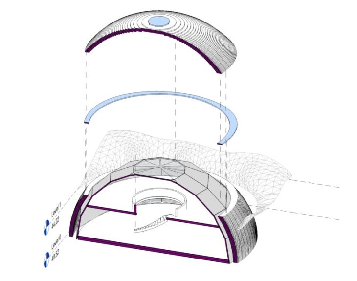 The external form is primarily driven by the construction method, in this case, 3D printing. The construction sequence understands that the room pods will come in a spaceship pre-fabricated ready to be deployed. When the primary vertical and floor elements are placed, the 3 D printed skin will encapsulate the building on top of the already set up pre-fabricated livid pods.
