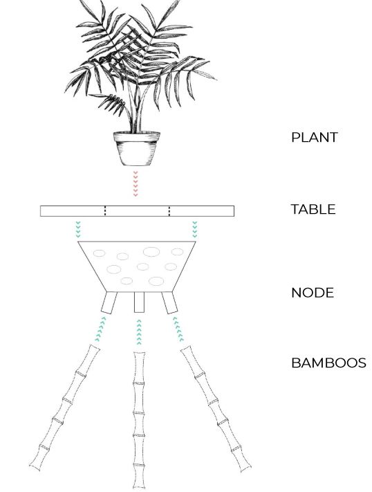 EACH 3 PIPES OF THE NODE WERE DESIGNED TO BE SLIGHTLY BIGGER THAN THE BAMBOOS SO THEY COULD BE FIXED INSIDE THEM AND ALLOW THE STABILITY OF THE TABLE.