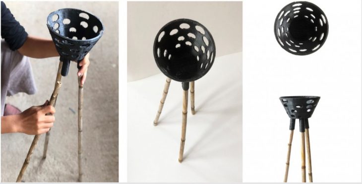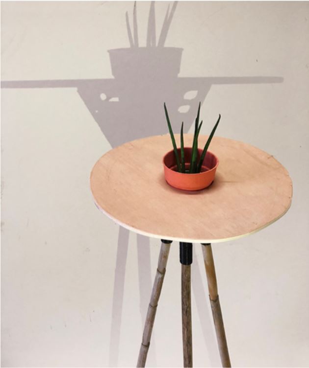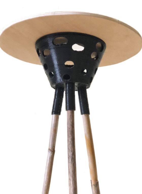 The first one is the MULTREE, which is one simple node designed to have multiple functions. Its aim is to structure the furniture but also to be a part of it, as it is a vase and at the same time a small table. The circular vase made on the 3D printer is perforated with small circles to continue the same shape of all the materials used to build the table, like the bamboo pipe, the vase, the node and the piece of wood. This last one closes the vase on the top, which also has a whole in its middle for the plant to fit in. The three supports on the bottom of the vase are connected to one bamboo each, which allows the furniture to stand up.