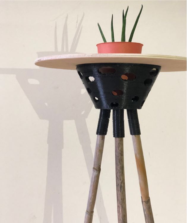 The first one is the MULTREE, which is one simple node designed to have multiple functions. Its aim is to structure the furniture but also to be a part of it, as it is a vase and at the same time a small table. The circular vase made on the 3D printer is perforated with small circles to continue the same shape of all the materials used to build the table, like the bamboo pipe, the vase, the node and the piece of wood. This last one closes the vase on the top, which also has a whole in its middle for the plant to fit in. The three supports on the bottom of the vase are connected to one bamboo each, which allows the furniture to stand up.