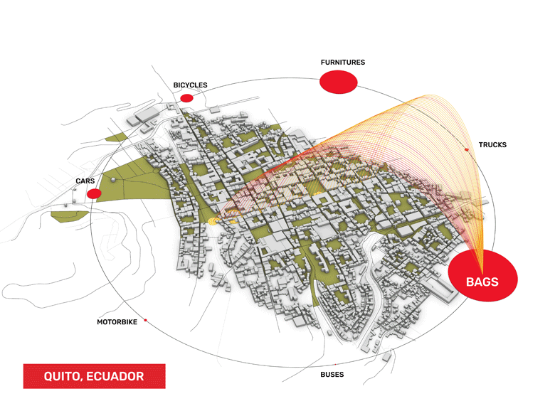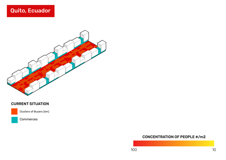 - Street in Quito old center is fully occupied with commerce that forces people to stick around. Some of these could be moved to the big square next block and therefore disperse people in space. Commercial layer here gives more opportunities to transportation.