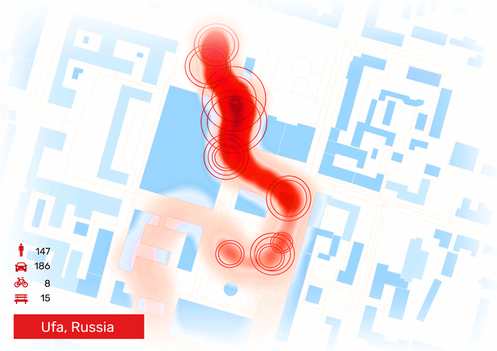 According to this we came up with different conceptual proposals for each city. The narrow sidewalk in Ufa makes people crowd on it. And those who wait at the bus stop prevent others from freely walking through. So, the transportation layer (road) is proposed to narrow down in order to give more space to the sidewalk.