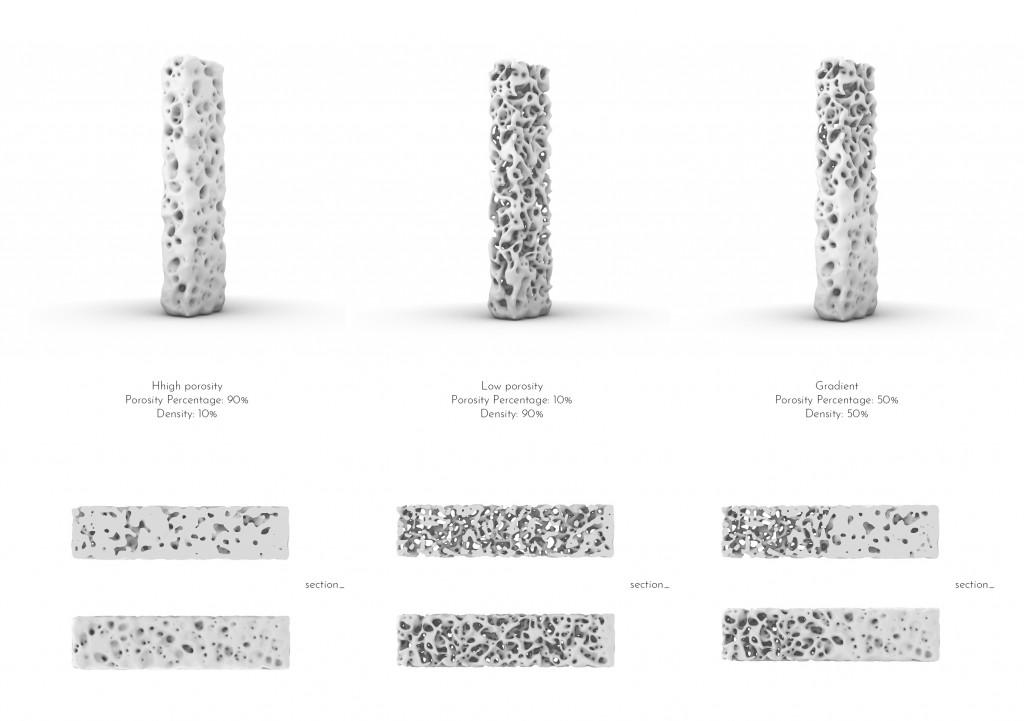 We defined a porous catalog according to the size and density of the naturally formed boubles by using different amounts of sodium bicarbonate. Since our studies showed that the range is limited we experimented with certain additives such as salt, sugar, hydogel, fresh yeast and styrofoam balls. We tryied to find additives that dissolve while heated. Fresh yeast turned out to be closest to expected. However, the counterintuitive aspect of adding a material to create porpous voids halted this process. Sugar and hydrogel dissolved during the process of solidification, but they got mixed up with the base material that changed its consistency. In the case of styrofoam balls the fact of adding a disadvantageous material such as plastic stopped us from further usage. In the same time triggered further research in order to find a sustainable solution for creating high scale porosity.
