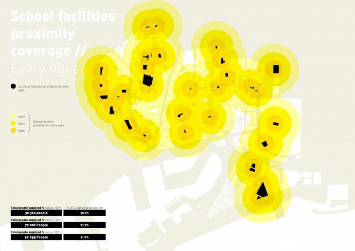 Thirdly, we analysed the proximity to the everyday needs. From alimentary to public facilities; we defined some specific proximity radius in order to ensure a satisfying coverage by these services.