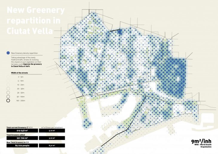 Finally, our research explored several ways to improve the greenery in the old district of Barcelona, which gather a complex network of narrow streets. Taking into account the land use as well as the presence of NDVI, we identified a lack of green spaces. We started by adding a certain amount of green on the widest streets. But this was not enough to achieve the 9 sqm per inhabitant defined by the World Heath Organization. So, where terraces were available, green roofs were proposed.