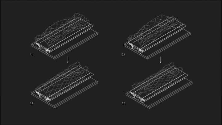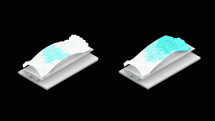 This scale of approach would generate a membrane that reacts according to the preagreements of activities between the different districts but it will consider as well the amount of people within the platform and the availability of buildings that can be activated to create the network. This would generate different flows that will impact in real time on the shaping of the membrane. A tracking system could potentially be activated, inflating obstacles to avoid breaking rules of social distancing.