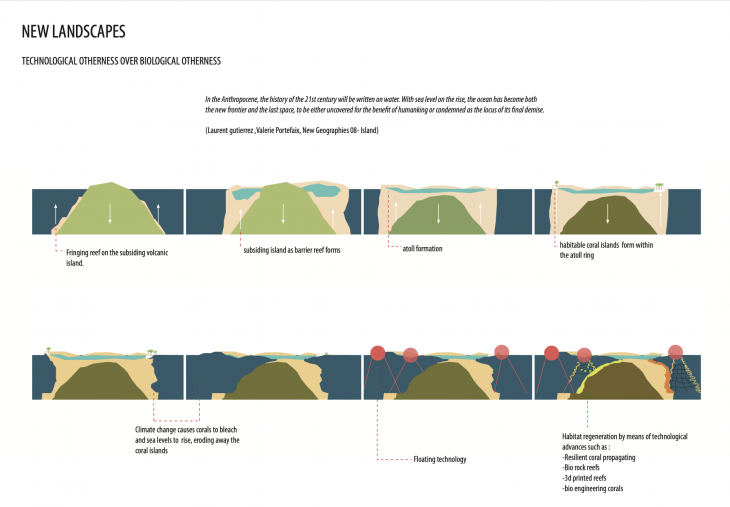 Coral reefs have demonstrated their ability to create new landscapes and adapt to past events of sea level rise by growing upwards on the fringe of a subsiding volcano, and overtime mature into barrier reef and then into atolls where coral islands form and mature enough eventually for human habitation. In the present day, due to the human activity driven climate change phenomena that we are experiencing coral reefs are at the risk of disappearance, while these coral reefs amount to less than 1% of the ocean itself, extinction of coral reefs will have drastic impacts on many communities , especially to that of coastal and islands. Island nations such as Kiribati, Tuvalu, The Maldives and the Republic of Marshall Islands which are made exclusively of coral atolls, risks being wiped out of the earth’s surface entirely within the century. Although technological advances are what has brought us to the era of the Anthropocene, this paper seeks to understand if more technology just maybe what is needed to resolve if not revert the consequences of human actions that are causing for the current ecological collapse. Humans have been adapting to rising sea levels for many years in different contexts by means of land reclamation, usage of dikes, pumps , sea walls to either protect settlements from coastal erosion and flooding. we are beginning to rethink these traditional strategies as rising temperatures could bring too much water for even dikes and pumps to keep back, this new thinking speculates on idea of amphibious architectures such as floating technologies that provides more sustainable options and opportunity to maintain a healthy life below water as much as on newly created land.