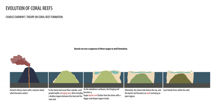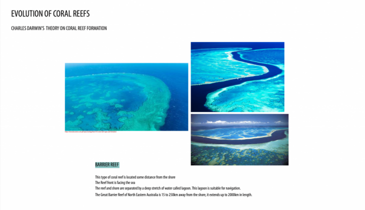 In conclusion, it is found that the evolution of coral reefs from fringing to atolls itself demonstrates nature’s ability to create new landscapes when the existing volcanic island subsided in to the seabed. In the face of modern day climate change, we can find hope in the capacity of the technological advances in helping create newer landscapes. In the case of coral islands climate change caused by technology needs to be addressed with more technology rather than seeking to return to a pristine and original biology.