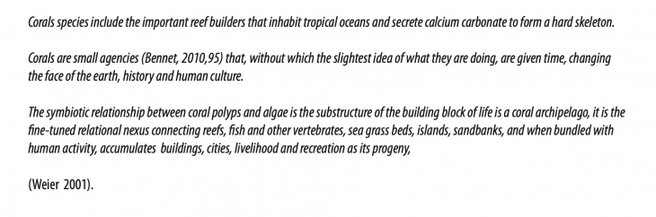 Corals are small agencies (Bennet, 2010,95) that, without which the slightest idea of what they are doing, are given time, changing the face of the earth, history and human culture. (Lindsay Bremmer, Thinking with a coral aquapelago)