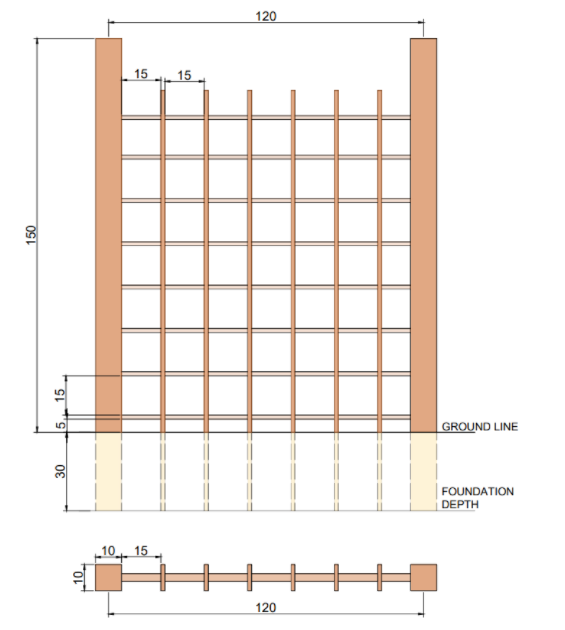 The entire module will be hinged to vertical supports which will be 30cm deep into the soil , that will act as a sturdy foundation for the fence.Each module consitis of 9 such off cut pieces and will be 1500mm in length. For the section near the Fab Lab 10 such modules will be required , out of which 2 of these will function as a gate. The stone foundation on site will act as medium onto which the gate will get locked .