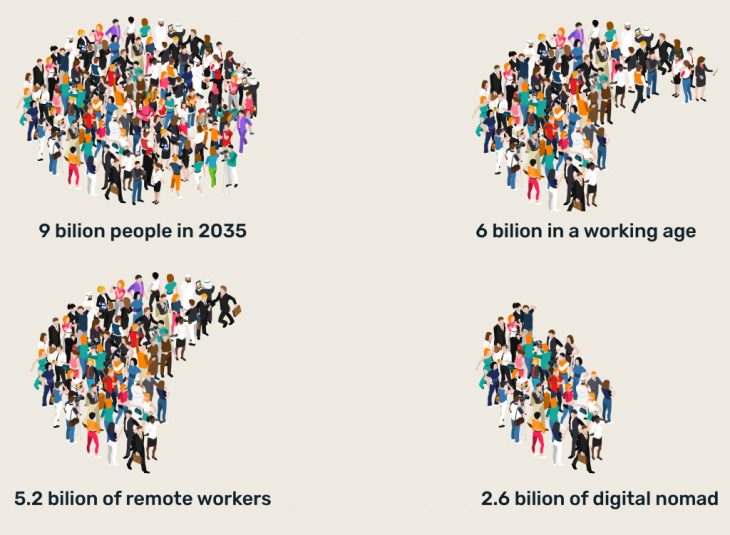 According to the United Nations report, there will be 9 billion people living on earth in 2035 of which 6 billion people will be in the working age.Extrapolating the graph about number of people choosing remote work in the US, we can speculate that in 2035 there will be 87% of people working remotely, and if only half of them will decide to choose a dynamic lifestyle and become a digital nomads, there will be 2.6 billion of digital nomads living on earth in 2035.