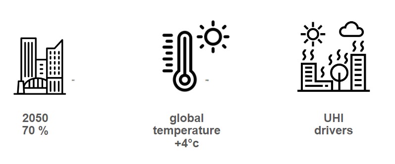 by 2050 about 70 % of the world’s population will live in cities. whilst global temperatures are rising towards +4°c, building facades are a main contributors to the urban heat island effect within cities. Increasing passive measures such as shading, reflectivity, thermal massing, adiabatic cooling can make strong contributions using our world resources more responsibly and make our cities more thermally resilient.