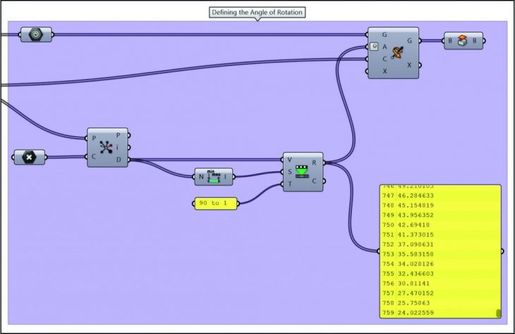 The variable parameters include the brick’s dimensions, the number of rows and columns of bricks, the randomisation parameter where the list is split and the angle of rotation depending on the attractor points. Using the above Pseudo Code, this facade system emerged.