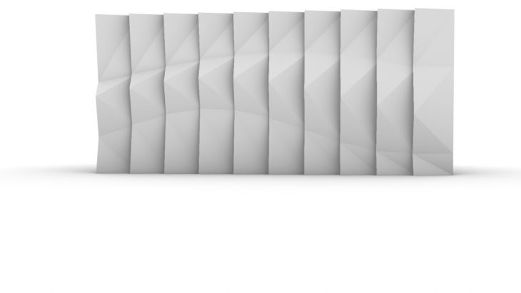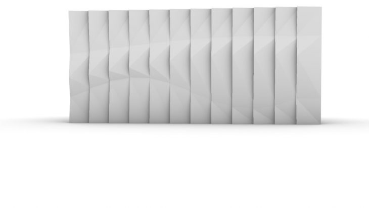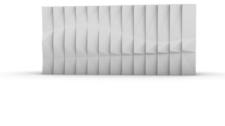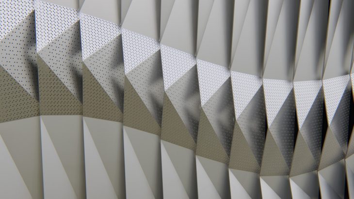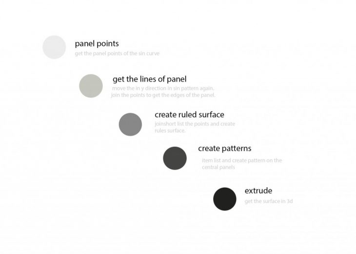 The design of the facade is focused on the objective of filtering and diluting direct sunlight aimed at the building. Some panels are composed of metal which are then perforated. The panels are also angled through gradual variation on degrees as a second method of light filtration. By decreasing the amount of solar heat gain within the interior space, the building is able to condition itself with heat reduction. The angles of the facade also allow for gaps in the outer shell which then provide natural ventilation into the interior spaces. With heat reduced and points of ventilation gained, the building is able to perform at an optimum as well as with minimal air conditioning units. The design itself works off of arrays and attractor point variations. A strip is composed using 3 points of attraction that will be manipulated in order to create the variation. Two points are lifted from the facade and edge lines of the panel then connect the points at varying lengths. The third point, the center point, is placed upon the facade and varies in distance on a singular plane. The two points are then connected to the center point. The panel is then arrayed and the points are slightly varied, this creates a more natural transition which in turn results to the facade’s wave.