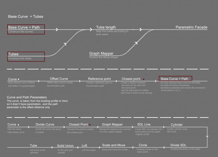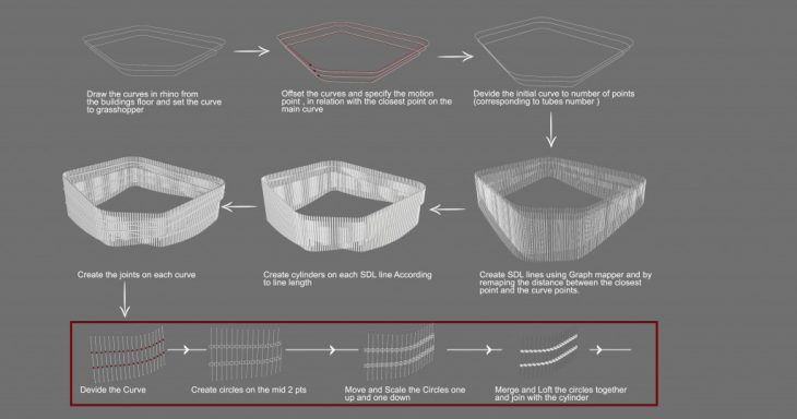 was to create rotating tubes along a path moving around the building.