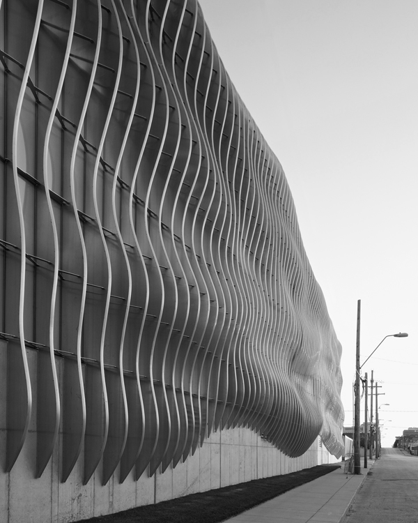 The Zahner Factory Expansion was designed by Crawford Architects back in 2011. The façade consists on a series of panels vertically oriented that create a wavy aspect thanks to the noise generated by the smooth curvatures of the panels.