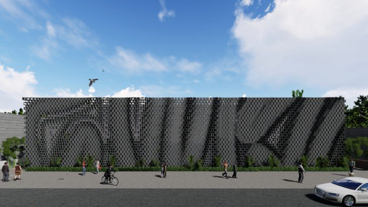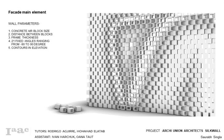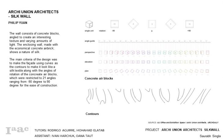 The project is an old warehouse on Jungong Road, Shanghai and was originally used to store fabrics. The external parametric wall of the warehouse encloses the building on three sides. Parametric processes have been used here to superimpose the contours and definition of silk undulating in the wind – a sign of its past. The wall consists of concrete blocks, angled to create an interesting texture and varying amounts of light. The enclosing wall, made with the economical concrete airbrick; shows the nature of silk.