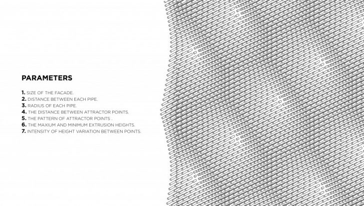 analyze and define the computational process behind it. The facade chosen for the task was designed by NUDES for BAD CAFÉ, located in Mumbai, India, in 2015. This form of parametric design is composed of pipes which extrude at varying heights.