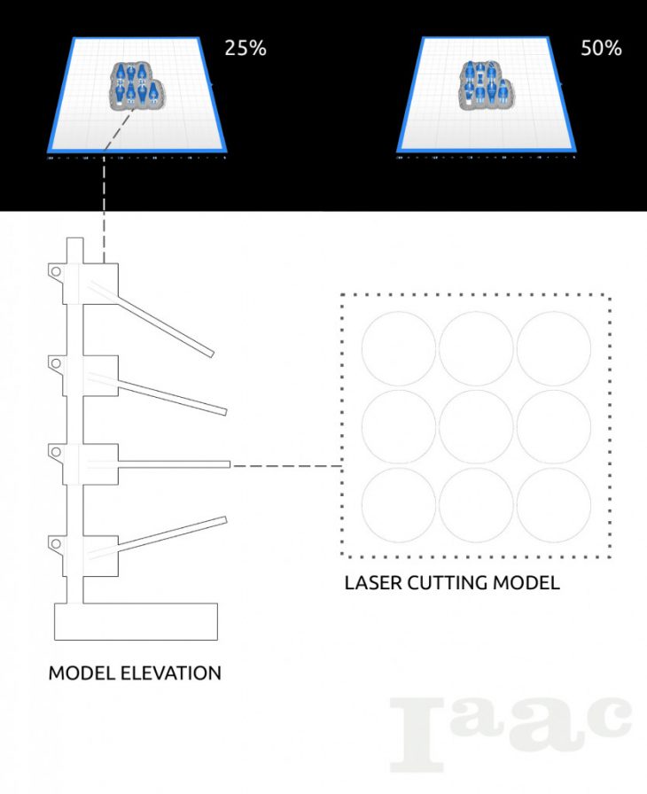 For this reason, our team designed a 3D printed connection that has a slit with a specified angle, which can be applied for each row. Circular disks vary in rotation angle along the z-axis, represented in 4 different orientations, and the angle of the opening that holds the disks controls the angle of rotation, which is a parametric variable that was used in this project to generate the connections.