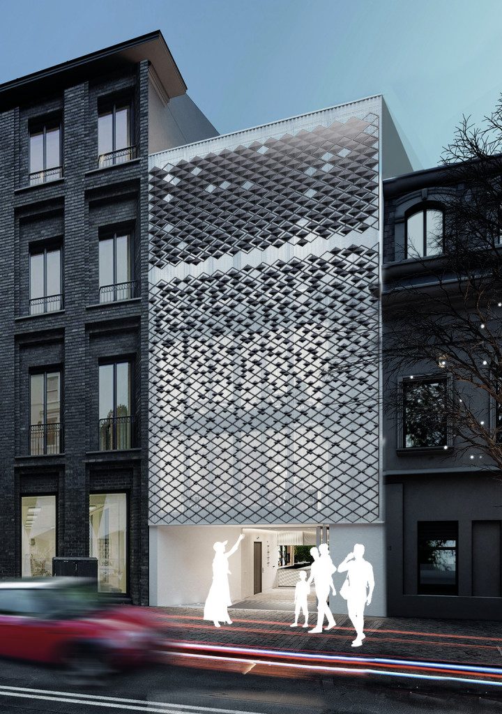 The stained-glass facade is partially shaded with the metal-grid frame, containing thousands of diamonds which randomly fit the openings. LED-embedded lozenges partially fill the screen’s latticework in painted sand-cast aluminum.