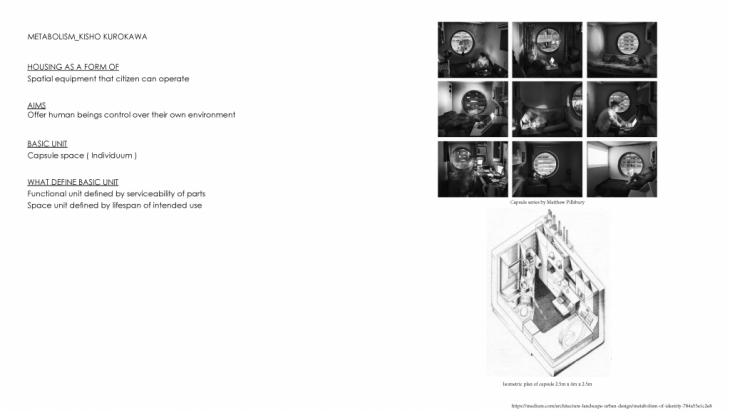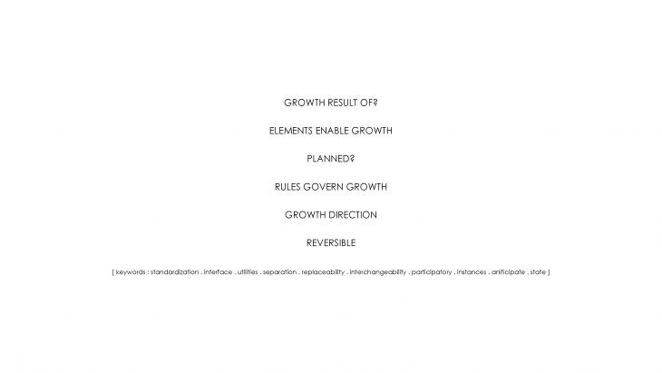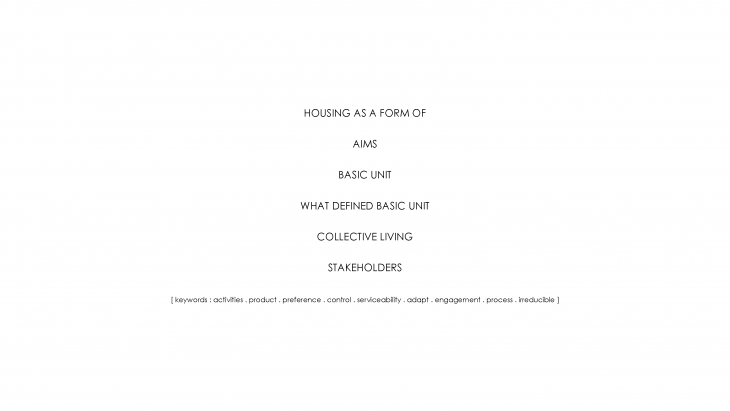 Apart from the contextual influence, another criterion that leads to a diverse elaboration between these concepts is what housing is being perceived as. This perception of housing can be realized by subdivision of the housing as an entirety into components with different cycles. A basic unit is an interface to which various systems can interact with each other. It is observed that the form housing is being compared to is indivisible from the context it is situated in, and this context has a trend with respect to time that in the pre-modern age housing is seen as a physicalization of the household activities derived more apparently from survival, and after the capitalist regime, it is more related to preferences and choices under the strong influence of consumerism, up till a point in time, which humanity has anticipate a risk of resource depletion and housing become an objective-driven process to combat resource scarcity. Two mainstream approaches, plug-in and pure additive have been adopted, each for its own strength. Plug-in is more scalable to be adopted in megastructure with its flexibility to grow vertically. Pure additive approach on the other hand gives its element more autonomy due to its non-hierarchical nature. Incremental housing is a hybridization of the two, having an additive expression with the action of fill-in being permitted in the system.