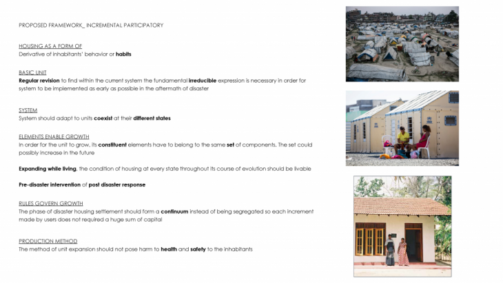 In this essay, post natural disaster housing will be discussed on its two important aspects, namely the incremental aspect and the participatory aspect. Historically, these two concepts have been hooked up with housing design for an extended period. To define incrementality, it does not necessarily imply an increment in mass, instead, most of the time the phrase is being referred to as increment of time. Therefore, incrementality in housing can be understood as changes occur in the physical structure over time. Incrementality is also the nature of a physical structure, from the explanation given by architectural theorists on this concept shows that different strategies have been applied as early as the design stage to ensure that the architecture increment in a manner that is beneficial to the inhabitants, and therefore it can be said that the ground zero state is not denoted by the completion of the initial structure. Participation is a means in which the physical structure could be changed, and as well as a means to achieve a changeable structure. It is very useful to look at the way major advocators attempted to systematize the implementation of these two concepts into housing design and how the two concepts mutually reinforced each other. It is found that even though some of the proposals has transverse over time into topics that are still being vigorously debated in the present days, their process of developing into such system are highly contextualized and therefore it is hypothesized that framing the two concepts on a present days Anthropocene scenario, characterized by more frequent occurrence of mega disaster in densely populated urban context, will foster the mutation of these two concepts into a new form of expression.
