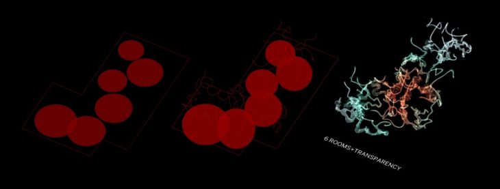 Iteration, created for 6 small rooms, connected with each other. The partitions have a medium level of transparency.