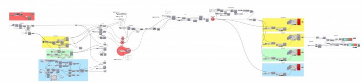 After inputting the amount, area and configuration of needed spaces into the script, the system designs amorphous shapes of needed density, thickness and transparency. Moreover, at night the installation can be lit in different colours, attracting peoples’ attention to the interior of the pavilion.