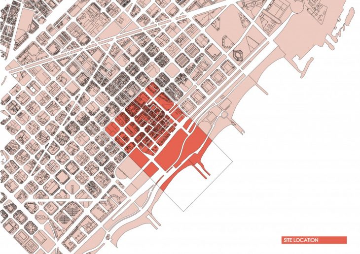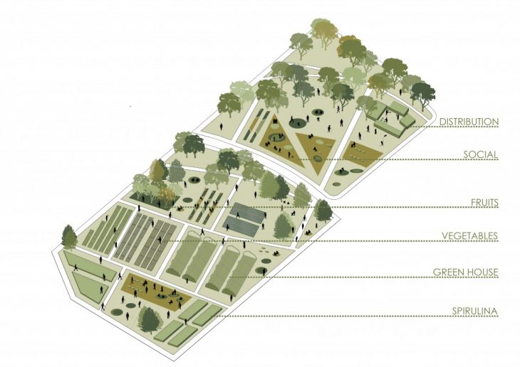 1- The production of Spirulina uses CO2 as a primary input and make the area more sustainable by improving the air quality. By photosynthesis, harvesting biomass is done by separating and dewatering the algae cells, extracting the oil and then turned into biofuel.This biofuel collection will be sent to the nearest power plant in the neighborhood which in turn can generate around 10 000 KWH/year of electricity. This cultivation is both a passive and active strategy, that reduces the CO2 and produces energy. 2- An area for urban farming, encouraging citizens into environmental activities through vegetable growing. Some of the vegetables require to be grown in greenhouses with ambient humidity level and temperature. 3- In addition to the existing trees on site, new trees will be planted for fruit production. 4- Creating public spaces and merging them in farming areas has a high environmental value to the city, becoming a new catalyst of public spaces. With awareness activities taking place, the community can be encouraged to grow their own food. 5- On average, a person consumes 200g of vegetables and 40g of fruit per day. We assume that 10m2 of land is needed per person to produce these foods. The urban farming area can indeed produce 35% of the total fruit and vegetable consumption of the neighborhood. These food will be distributed in a market located the historic Placa de Prim, that was once a gathering area for the working class.