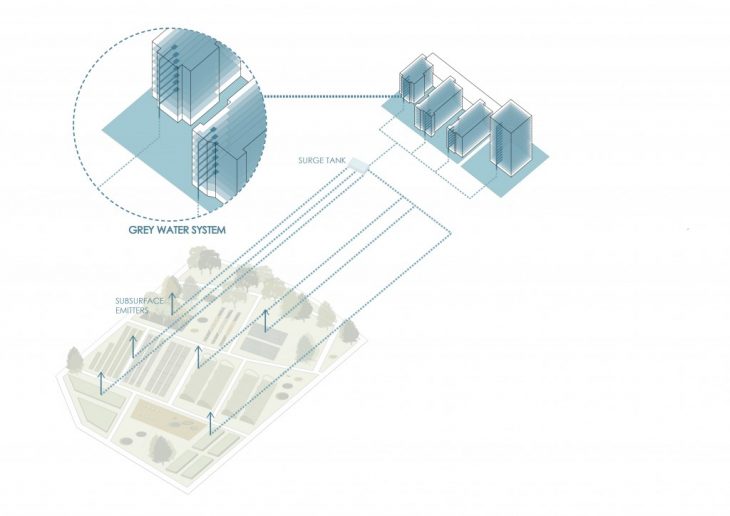 The newly built buildings facing the site will contribute in a new water management system. Grey water will be collected into a surge tank on site and then distributed through different emitters on site for irrigation.