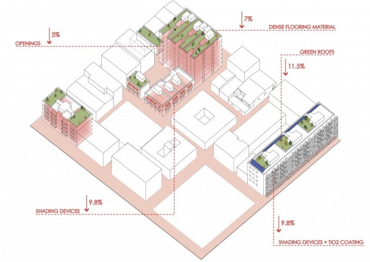 The old town houses 580 people with a total of 145 apartments. According to the municipality’s statistics, each household consumes 8900 kWh/year of energy and 25% of this number is dedicated to electricity consumption. Heating and cooling in Barcelona consumes around 41% of total electricity consumption, which is the highest consumption sector. By retrofitting buildings in the old town, an average of 9% decrease of electricity consumption per household can be reached by providing proper ventilation with openings, enough sunlight in winter and preservation of heat by dense flooring materials, preventing overheating in summer and the use of green roofs.