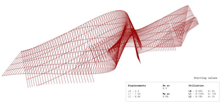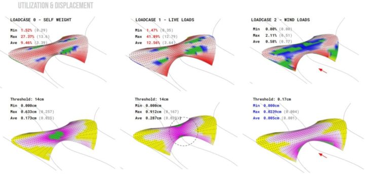 Our initial idea aimed to connect the landscape with a curved structure that grows organically from it. We developed a doubly-curved hollow shell; the geometry is bent in three planes; XY, YZ and XZ planes. With this geometry, we ran some initial analysis to check deflection and utilisation for three loadcases (0 – self-weight, 1 – live loads, and 2 – wind loads) and to see how the top and bottom components of the shell will behave. For the sake of clarity, we will call this geometry Option 1