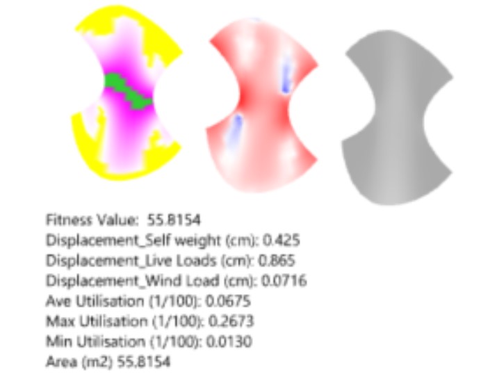 In conclusion, we found that the slightest changes to geometric proportions have implications for structural performance. We also identified structural depth as one of the most critical dimensions to consider when designing. Varying material thicknesses and distribution also have notable impacts on structural behaviour under different load types. Additionally, while this exploration only sought to optimise the geometry by removal of materials and thickening cross-section, we think using the principal stresses to create a beam grid supporting a thinner surface shell may produce similar or better outcomes and could be worth considering for further analysis.