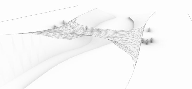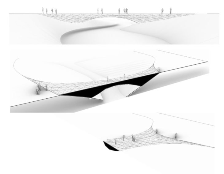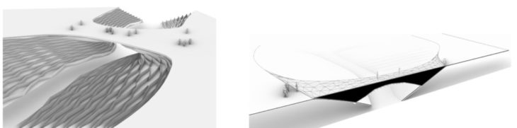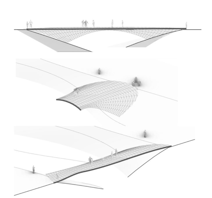 Given that the lower shell is much more structurally effective and also to have a walkable surface for the bridge, we flipped the lower shell geometry to create and adapted it to fit within the landscape while keeping the curvature in 3 planes. This new geometry = Option 2