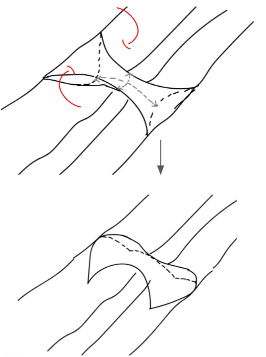 As shown in the diagram, the interruption that occurs in the transmission of the loads to the supports must be completely counteracted by the element perpendicular to the main stress. The utilization will be gradually reduced until that element reaches a 90º angle with the ground. From this point on, the same equal and opposite effect will begin to occur at the other end of the section.