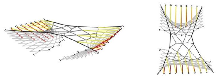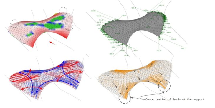 In this blogpost we will show you our explorations regarding studio, designing pavillion and bridge structures. In these attempts structures have been firstly analysed as shells, comparing regular grids to options derived from force flow.