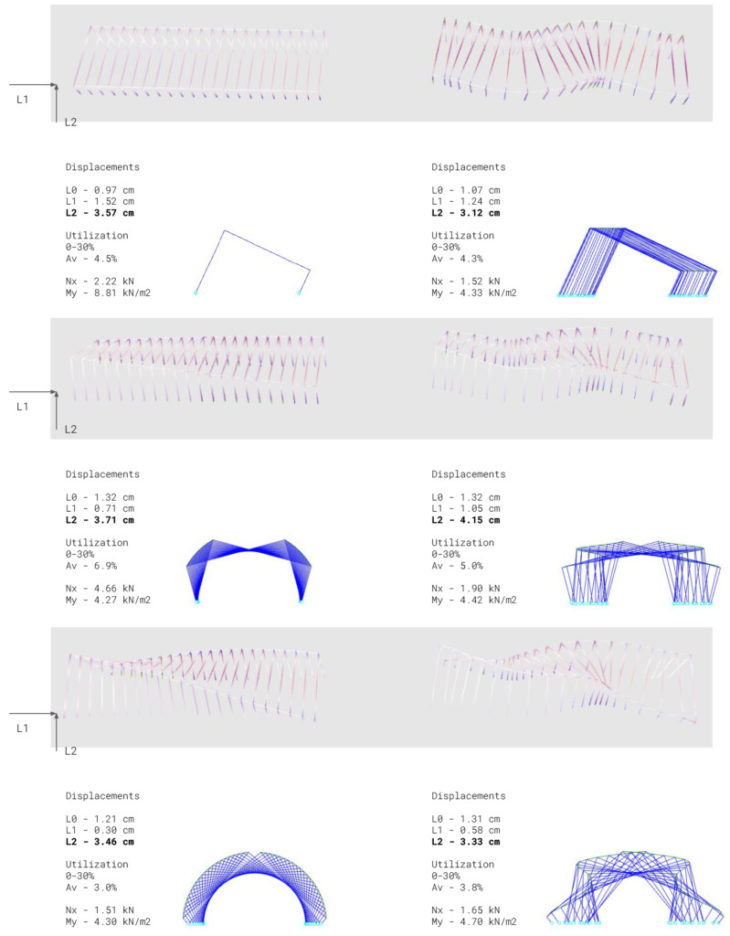 We analysed several compositions in Karamba and as expected compositions with fanned elements behave better. Fanned compositions increase overall stability because the moment frames are repeated in a different direction than the longitudinal wind direction.