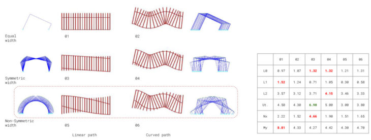 After the analysis of several sections with Karamba, we cannot observe a pattern that defines an option with a clearly better performance, although we can conclude that proposals that follow a curved path have in general a better behavior facing lateral loads.