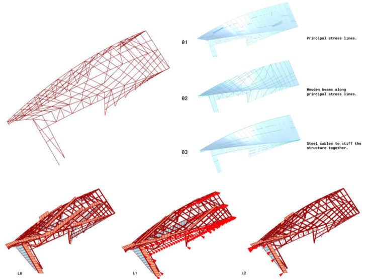 Through the shell stress lines we observe that forces flow in a arch like manner. They help us to better understand how the structure works, placing elements along axial forces, in order to avoid bending. Wooden columns are placed along force flow, and further steel elements are proposed to hold the structure together.
