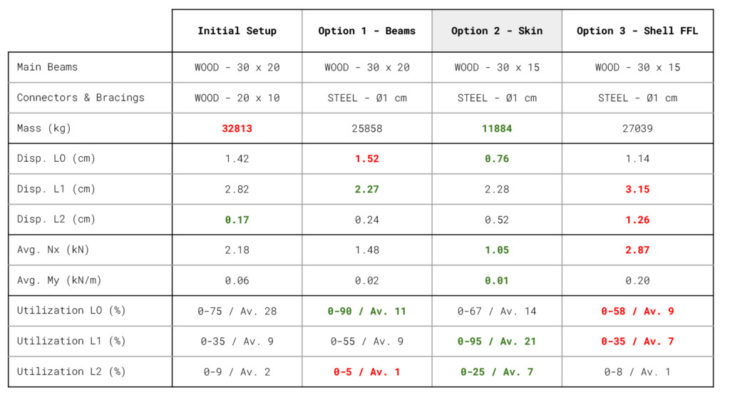 After the analysis of different proposals for our rectangular section pavilion, we conclude that the beam grid version that imitates a diamond skin (Option 2) is the most efficient one, having only one third of the weight of the other options and still showing the most optimised values for displacements and utilization in many cases. Its design proves to be very efficient against horizontal loads, as the diagonal beams act as bracings, generating a very strong stability system that also, as a plus, can be standardised.