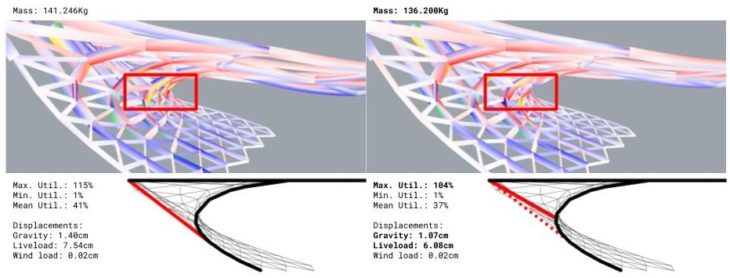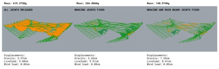 It is obvious that the version based on the shell forceflow lines could have still been considerably optimised to improve its lateral stability, but it requires a much more detailed study for it. The heterogeneity of its design demands to carefully analyse the different cross section of its elements, which also avoid the standardisation of the beams and therefore increases the cost of the structure.