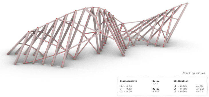 We chose to computationally optimise this geometry, adjusting the dimensions (bridge span, width and structural depth) and consequently its proportions, to derive a geometry that performs better in terms of displacement and utilisation. From the evolutionary solver analysis, we extracted the best 15 iterations from which we selected one that gave the minimal total deflection for all loadcases. This optimised geometry = Option 2B